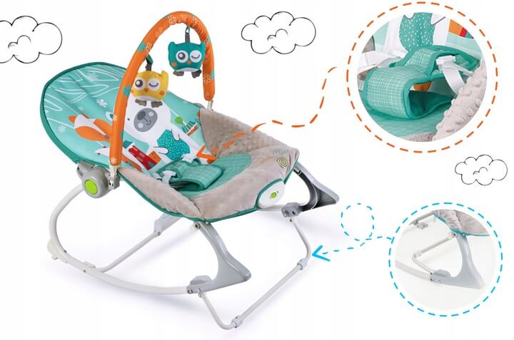 Lehátko je vybavené odnímateľnou čelenkou s pripevnenými hračkami - sovičkami. Zvieratká sú pripevnené suchým zipsom, teda sa dajú ľahko odnímať. Vaše dieťa zabaví, zatiaľ čo vy môžete odpočívať alebo sa venovať práci. Zvieratká na čelenke stimulujú zrak a rozvíjajú hmat dieťatka.