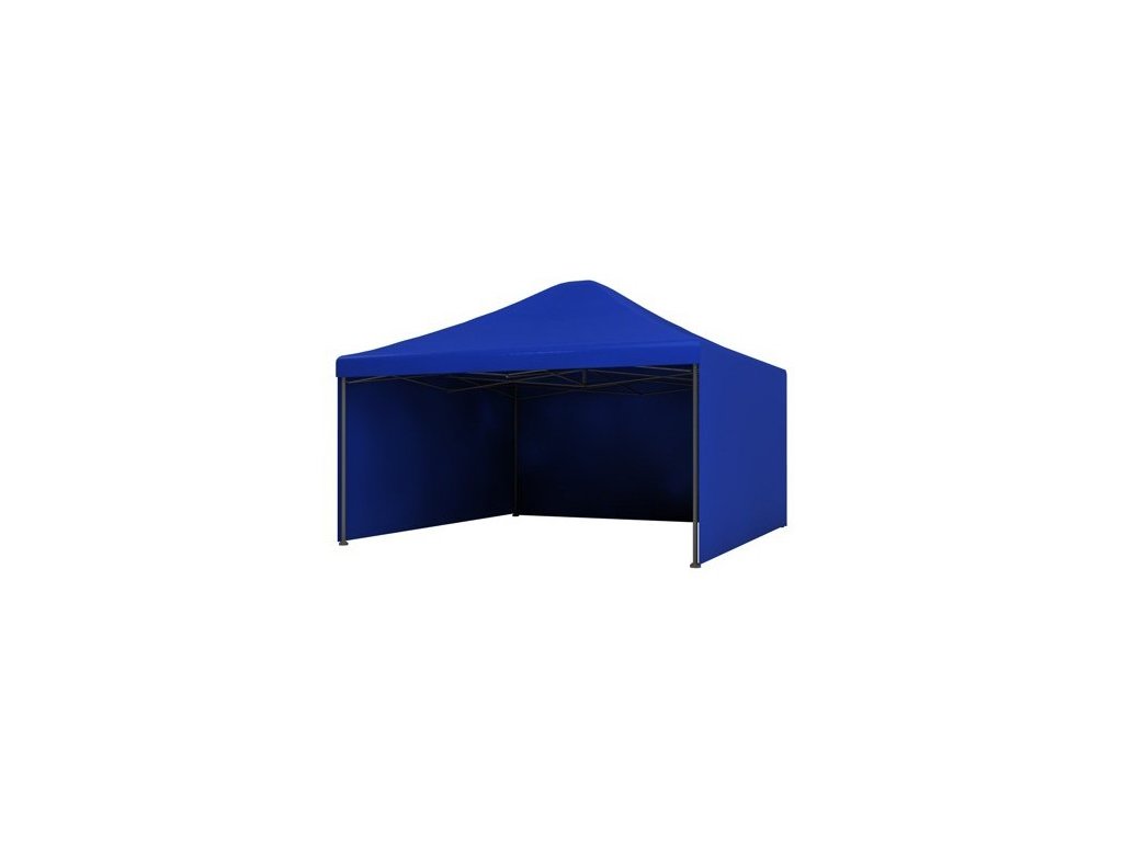 Modrý nožnicový stan 3x3m, so zosilnenou konštrukciou s profilom nohy 4x4cm, s hrúbkou 0,9mm. V balení nájdete aj prepravný obal. Nožnicový stan má 3 steny, strecha so suchým zipsom po celej dĺžke.