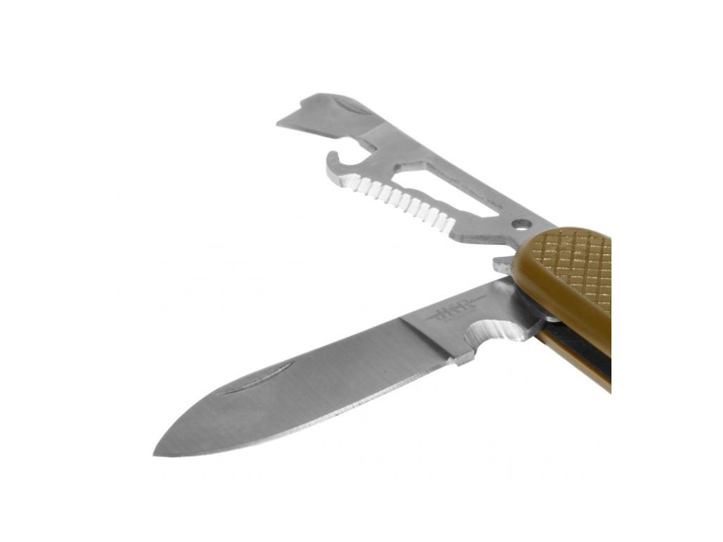 - Svojou skladacou štruktúrou sa podobá na klasický vreckový nôž, s tým rozdielom, že okrem základného náradia obsahuje plnohodnotné príbory ako lyžička, vidlička a nôž