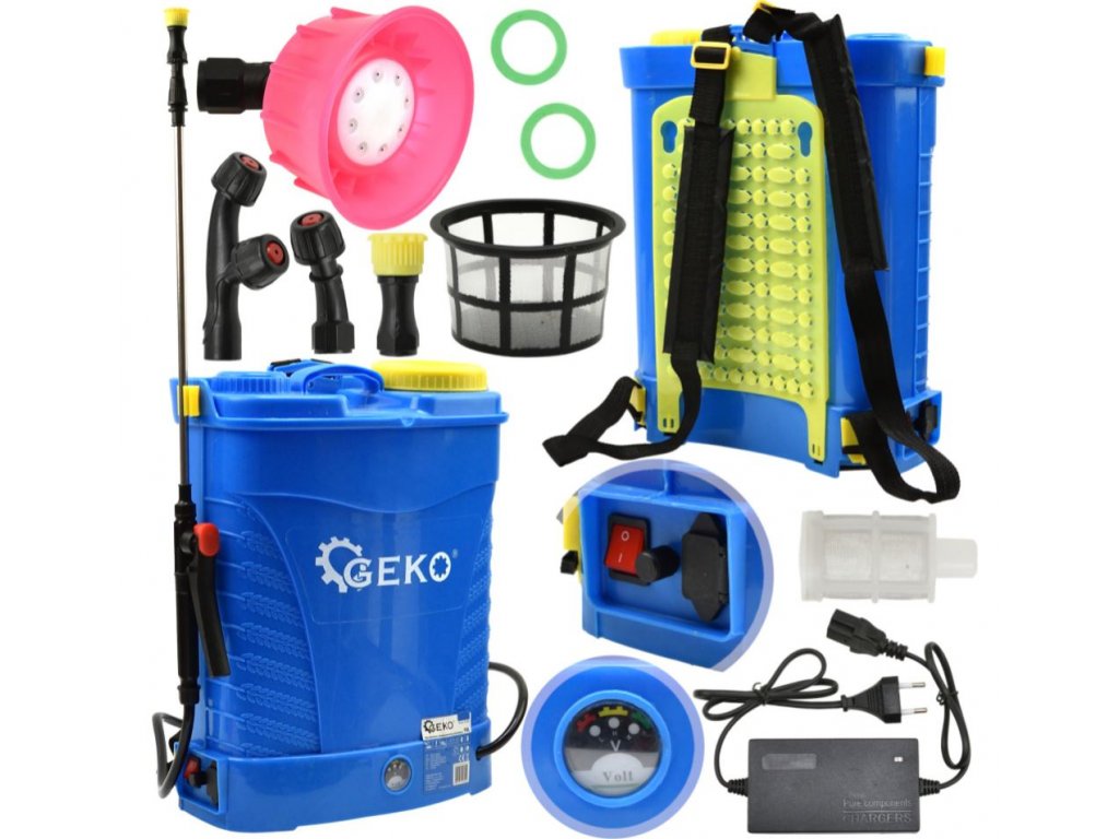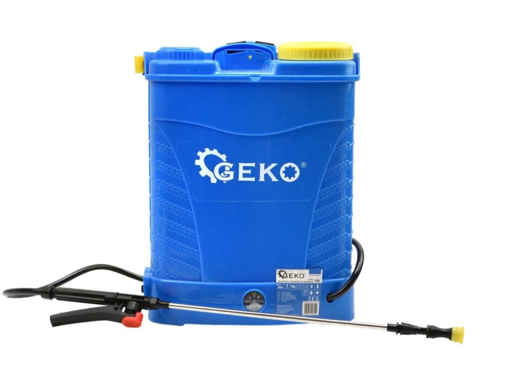 - Elektrický postrekovač od renomovanej spoločnosti GEKO je ľahko ovládateľný prístroj, ktorý je výbornou alternatívou k ručným postrekovačom. Batéria, ktorou je vybavený, umožní dlhé hodiny prevádzky.