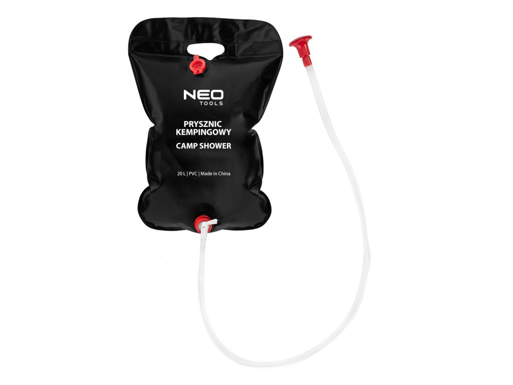 Kempingová sprcha 63-164 od spoločnosti NEO TOOLS je jednoduché zariadenie s praktickým využitím. Je vyrobená z PVC a má objem 20 litrov. Jej hmotnosť je len 400 g, vďaka čomu sa ľahko prenáša a prepravuje. Má 70 cm dlhú hadicu, vystuženú rukoväť a slúchadlo. Voda sa ohrieva pomocou solárnej energie. Kempingová sprcha je ideálna na cestovanie alebo kempovanie. Rozmery 62 x 39 cm.