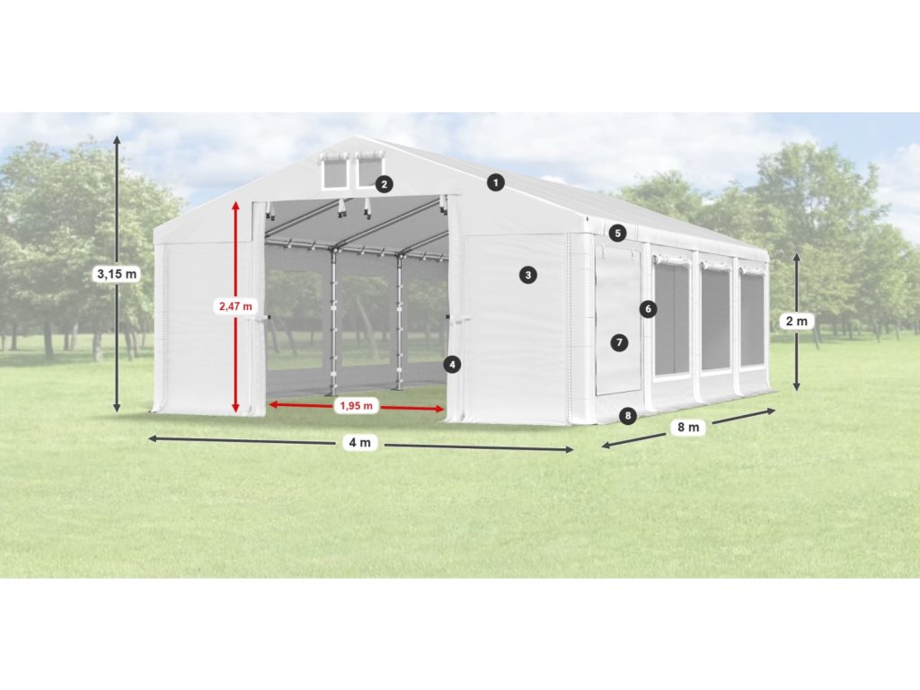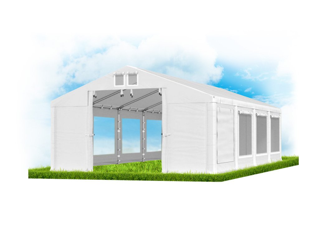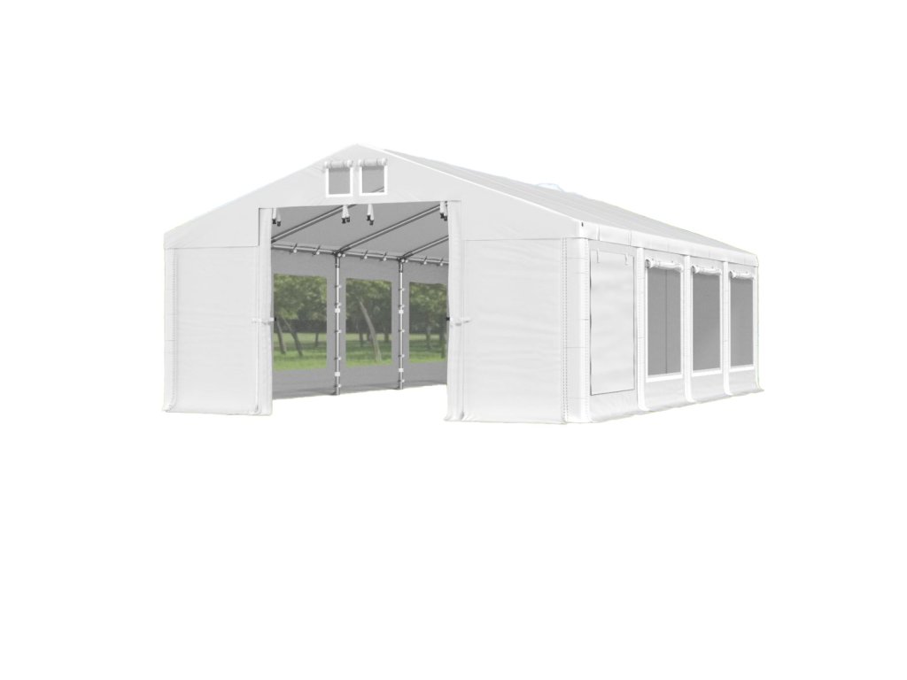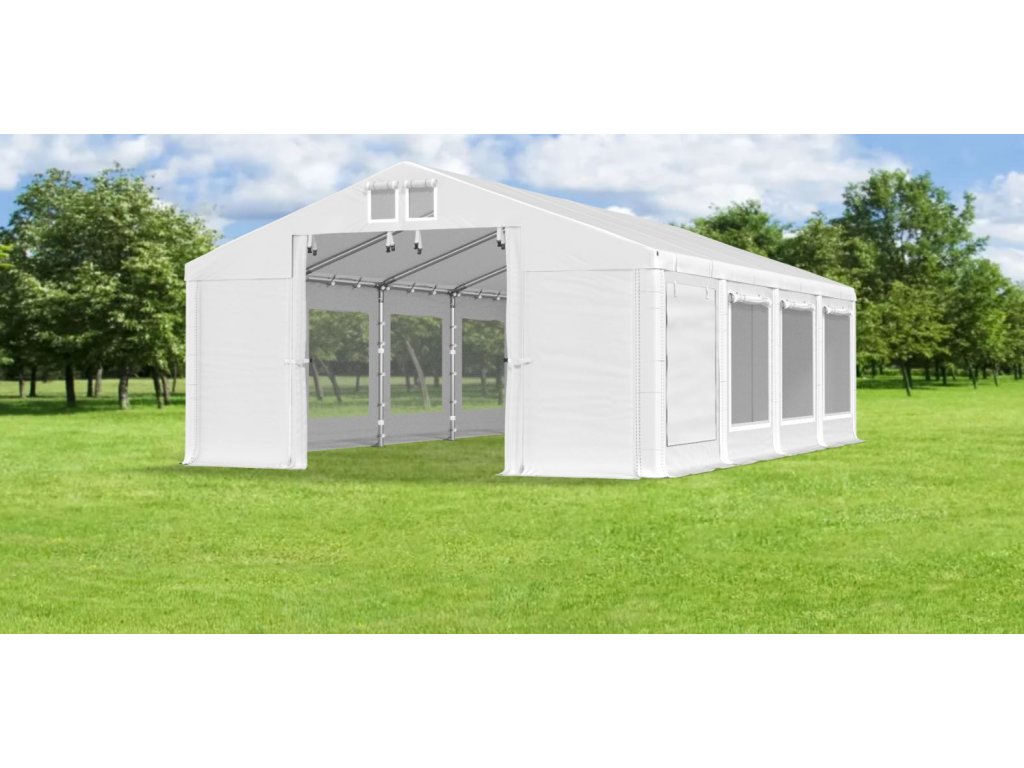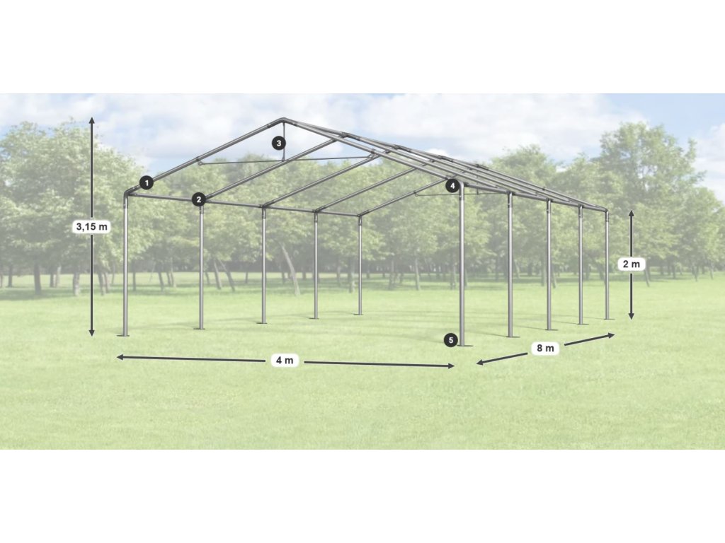 Pártystan v rozmere 4x8m s výškou 2m, opláštenie 560g/m2 s moskytierkou je výborný na rôzne akcie, alebo festivaly. Hrubá oceľová konštrukcia zabezpečuje odolnosť proti poveternostným podmienkam, stan je vyrobený z ľahkého materiálu, ktorý je veľmi odolný voči UV žiareniu, vode a plesniam. Partystan je skvelým riešením pre všetkých, ktorí chcú vytvoriť dokonalú atmosféru pre svoje párty, bez ohľadu na poveternostné podmienky. Tieto veľké stany sú navrhnuté tak, aby poskytovali dostatok priestoru pre hostí a zároveň ich chránili pred dažďom, vetrom alebo silným slnkom.