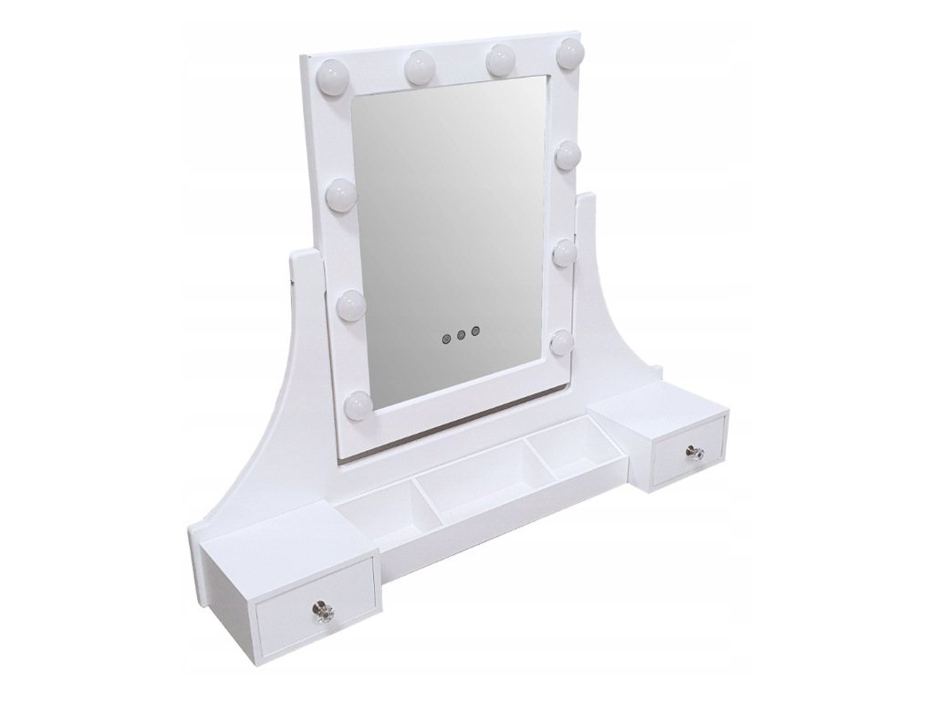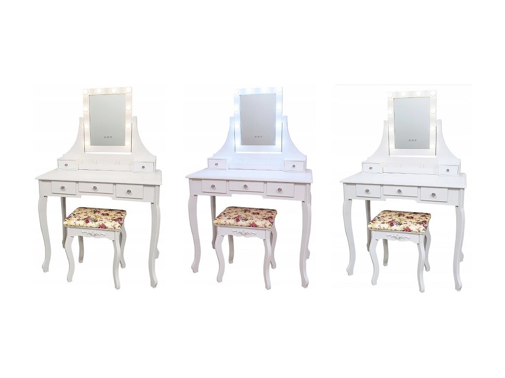 Vďaka veľkému oblému LED zrkadlu s podsvietením tiež odhalíte akýkoľvek nedostatok svojej krásy. S týmto toaletným stolíkom si určite sadnete, a to nielen kvôli pohodlnej čalúnenej taburetke, ktorú po použití môžete vsunúť priamo pod stolík. LED osvetlenie sa zapína intuitívnym dotykovým senzorom zabudovaným v zrkadle. Toaletný stolík má 10 LED diód a v každej sa dá nastaviť teplota svetla dotykom na konkrétne miesto na zrkadle.